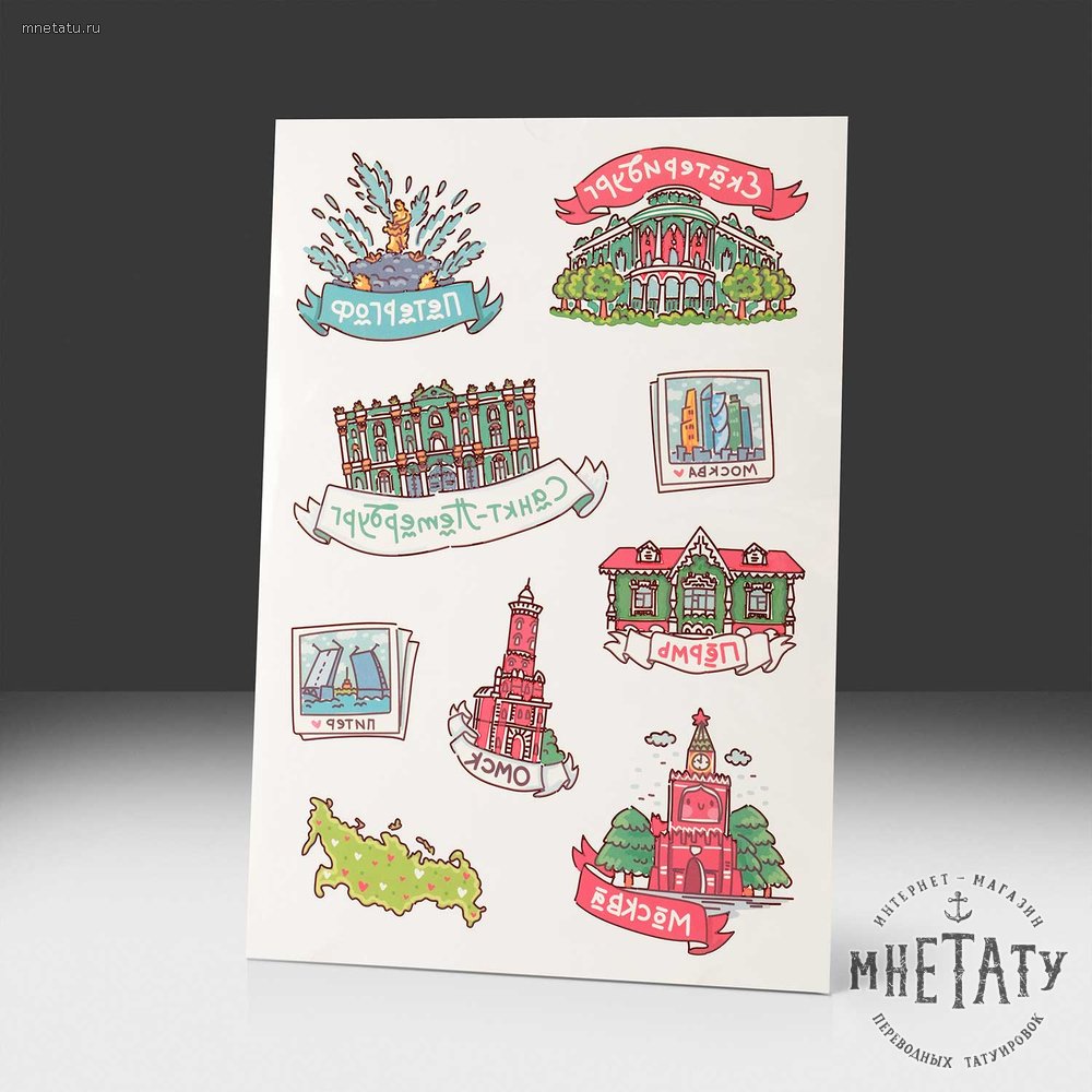 Набор переводных тату "Города России" позволит вам погрузиться в увлекательный мир самых известных городов России. В этом наборе вы найдете татуировки, изображающие Москву, Санкт-Петербург, Екатеринбург и Омск - города, каждый из которых обладает своим уникальным очарованием.