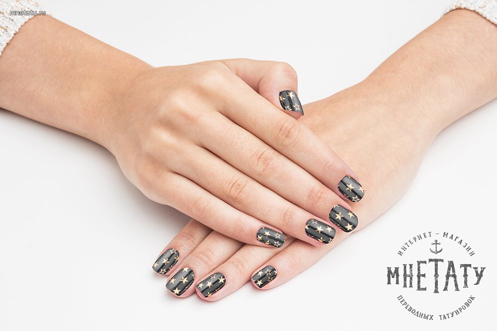 В подобном оформлении являются эталоном красоты. Золотистые элементы выполнены на белом фоне – идеальное сочетание оттенков. Все звезды на наклейках одинакового размера. Звездный стиль подходит всем, кто отдает предпочтение ярким краскам и позитивному настроению. Данный маникюр зарядит носителя положительной энергией на весь день. Созданный рисунок татуировки способен выделить девушку среди окружающих – яркость применяемых цветов невзначай бросаются в глаза. Звездочки идеально подойдут для повседневного маникюра. Аккуратность линий имитирует натуральный рисунок, что указывает на успешность девушки и ее хорошее настроение.