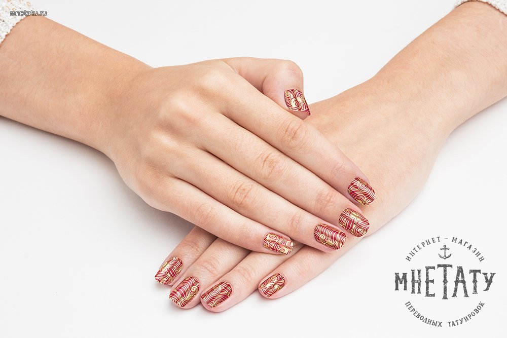 Золотые краски бросаются в глаза, поэтому женщина всегда будет в центре внимания. Четкость линий имитирует натуральный рисунок, созданный профессиональным мастером с использованием гелей и лаков. Рисунок представляет собой плавные линии, имитирующие волны. Главный цвет изображения – золотистый. Полоски на переводной татуировке максимально насыщают рисунок и делают его уникальным. Наклейка позволит создать собственное водное пространство у себя на руках. Волны находятся в движении. Подвижность изображения указывает на положительную энергию, присутствующую у носителя данного маникюра. Женственный цвет подчеркивает нежность представительницы слабого пола.