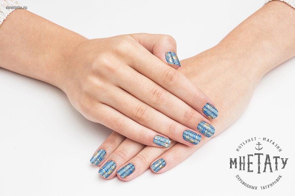 Переводные наклейки на ногти – новое направление в области маникюра. Данный рисунок представляет собой переводное тату, легко наносящееся на ногти. Тату в стиле «Волны» прекрасно дополнит образ успешной женщины.