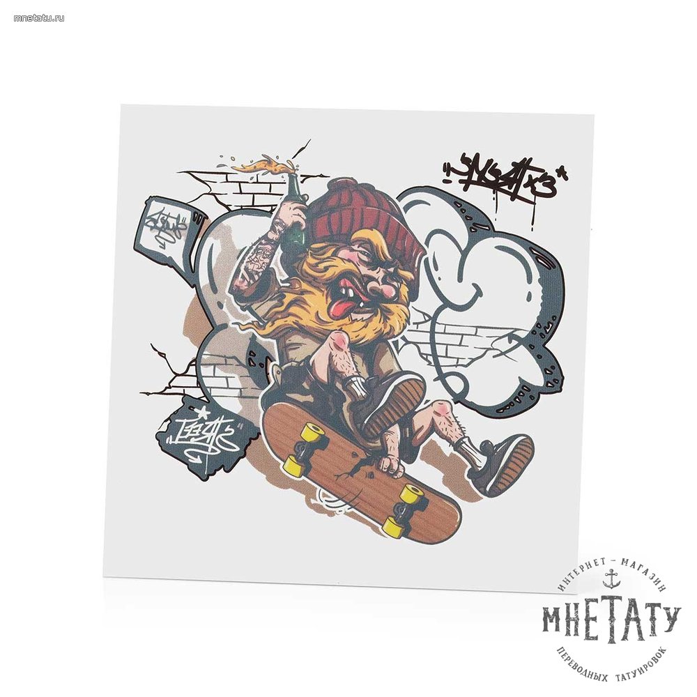 Татуировка опять на юморе — все тот же скейтбордист «за рулем» скейта и с бутылкой явно не газировки. Хотя, в таком отчаянном и местами головокружительном виде спорта чего только не увидишь.