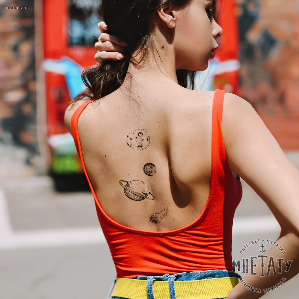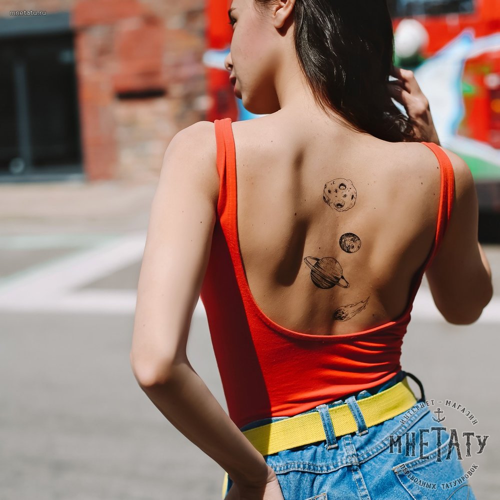 Серия переводных татуировок в космическом стиле с изображением разных планет нашей солнечной системы — Млечный путь. Это и познавательно, и креативно. Можно так же при желании сделать целую звездную карту на теле. Татуировки больше детские. Но иногда и встречались представители среди взрослых девушек, которые хотели некоторые элементы сделать и себе. Татуировки в цветном оформлении ярче всего выглядят и намного приятней, поэтому рекомендуем сразу оформлять контрастно их. Работа наносится быстро, так же легко снимается потом. Аллергии или раздражений для кожи нет. В тату-салоне «МнеТату», вы всегда можете креативно подойти к вашим желаниям создать уникальный стиль, а наши мастера вам помогут в этом.