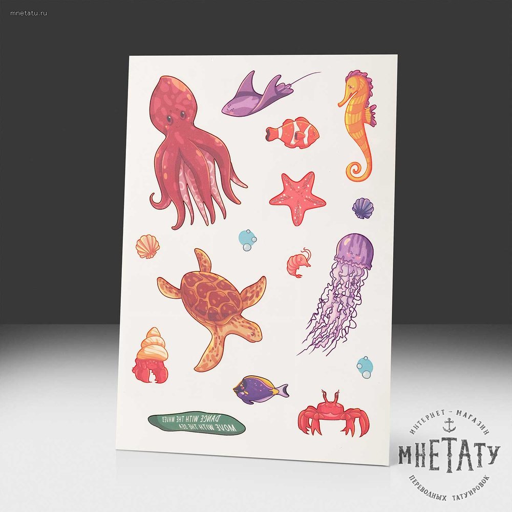 В этом наборе можно найти разнообразные татуировки, включая рыбок, краба, медузу, черепаху и других обитателей морского мира. Каждая татуировка выполнена в ярких и насыщенных цветах, что делает их привлекательными и заметными на коже. Рисованные образы обитателей моря привносят в набор игривость и веселое настроение.