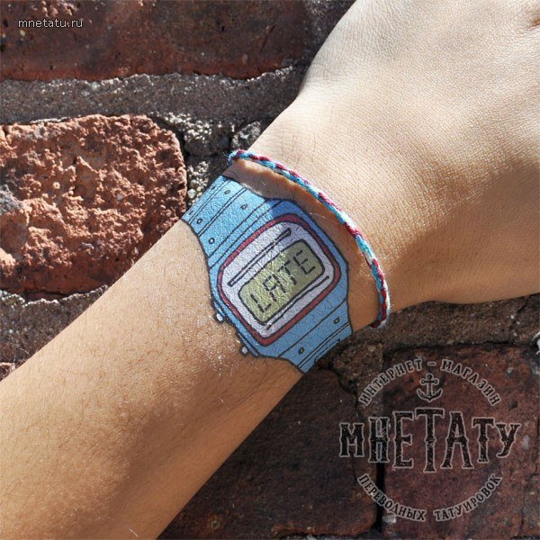 Эти классные часы переводилка сейчас хит продаж. Посмотрим правде в глаза: мы носим часы для того чтобы в нужный момент узнать время и часто оказывается, что мы опаздываем куда-то. Можно избавить себя от необходимости высматривать время на часах, ведь единственное что действительно нужно знать так это то, что ты опаздываешь и пора бы поторопиться!. Эта тату имеет несколько цветов.